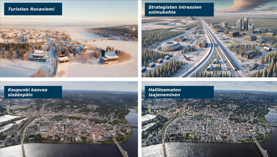 Alla kuvataan yleisellä tasolla skenaarioprosessi, joka räätälöidään kuitenkin aina asiakaskohtaisten tarpeiden mukaan. Kuvassa Rovaniemen strategisen yleiskaavan 2050 tulevaisuusskenaarioiden kuvitusta.
